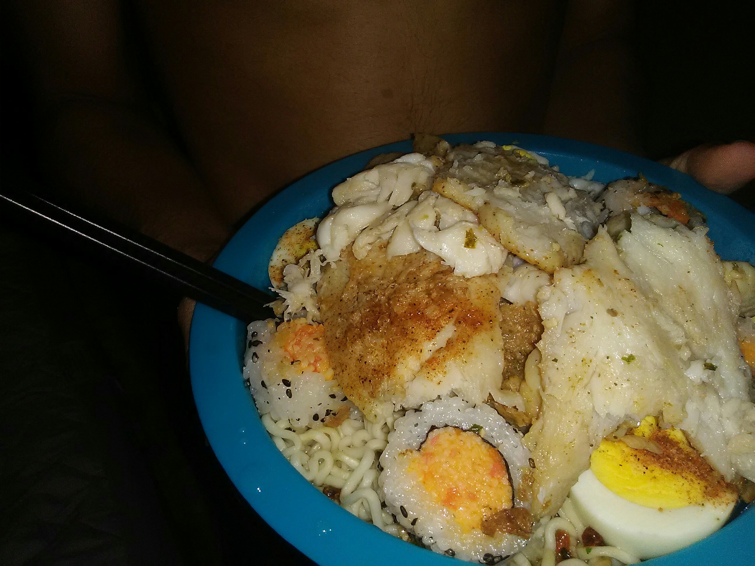 This beautiful meal is made up of noodle’s ,shrimps,boil eggs, scalpels, spice crab rolls, fish all sauteed in a butter lemon sauce with a beautiful lobster tail on top. Now this is a meal for the New Leaf Gang to enjoy.